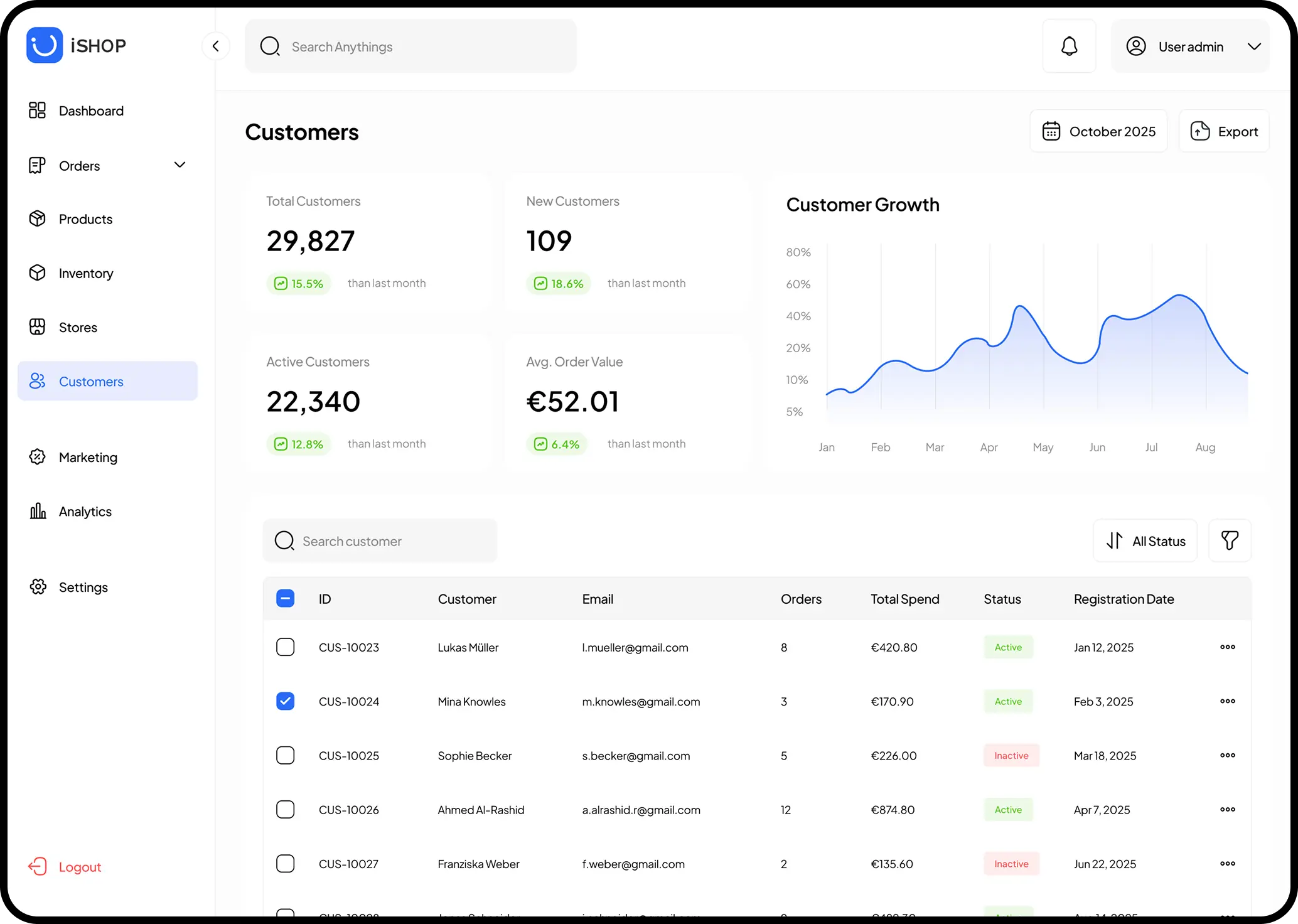 29,827 customer records unified with full purchase history and growth trends — replacing disconnected member data spread across separate systems.