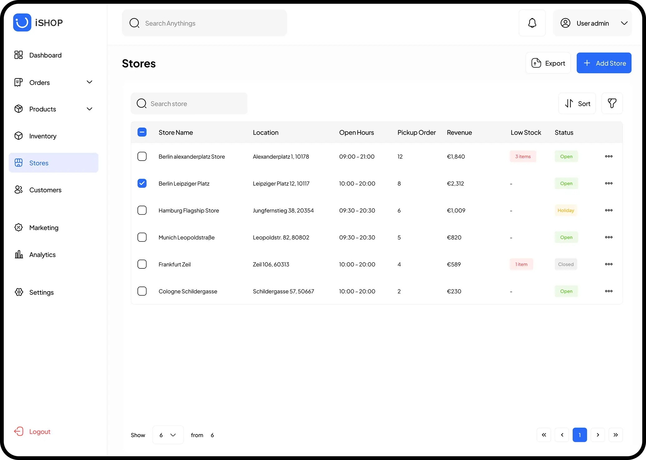 All locations in one view — open hours, revenue, pickup orders, and low-stock alerts per store. No more manual aggregation across separate reports.